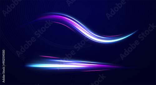 Neon glowing lines, spiral effect, fast car speed. Speed light streaks vector background with blurred fast moving light effect, blue purple colors on black.