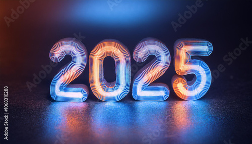 Neon glowing number 2025 on dark background. New Year. 3D rendering.