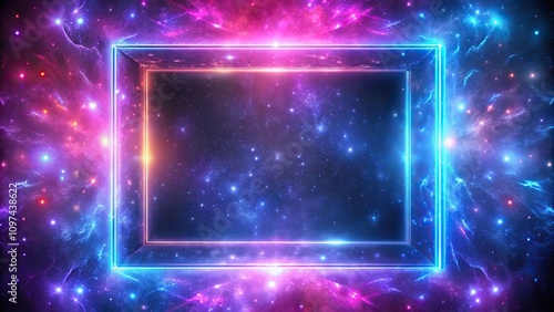 Neon glowing picture frame with abstract galaxy portal and fluorescent disco background, Neon, glossy, rectangle, glowing