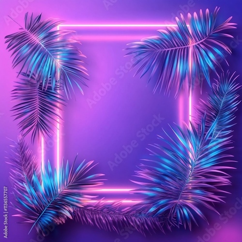 Neon Glowing Tropical Palm Leaves on Vibrant Violet Background Design Template with Copy Space