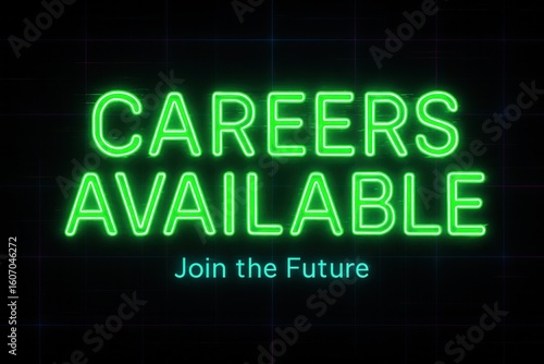 Neon green and blue sign with the words "CAREERS AVAILABLE" and "Join the Future" against a dark background, representing job opportunities and futuristic employment concepts.