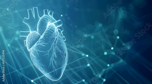 Neon heart on the background of a blurred screen with heart rate waves. Concept of medicine