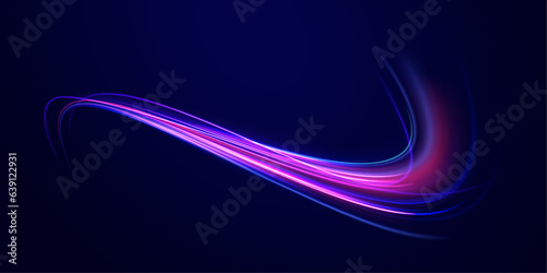 Neon light effect on a winding street. Speed light streaks vector background with blurred fast moving light effect, blue purple colors on black.