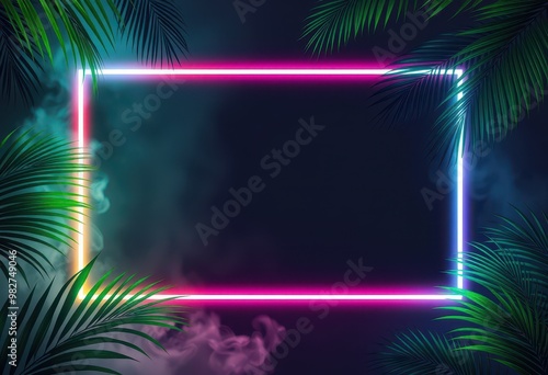 Neon Light Frame with Tropical Palm Leaves and Smoke