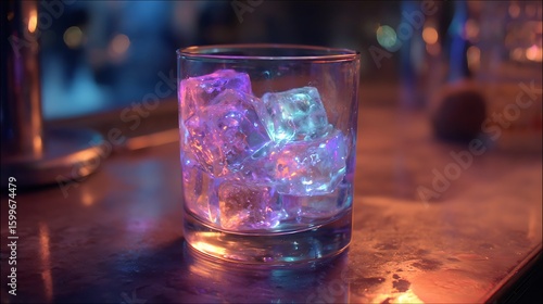 Neon light reflecting off ice in glass tumbler