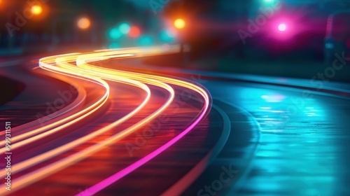 Neon light streaks illuminate the night cityscape in abstract motion, creating a dynamic and vibrant glow.
