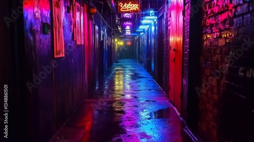 Neon lights illuminate a rainy urban alleyway at night with a captivating atmosphere