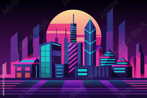 Neon Lights Over Futuristic City Skyline at Night – Modern Urban Vector Illustration