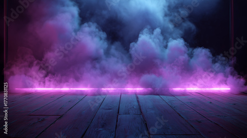 Neon lights, smoke and wood texture create an evocative atmosphere