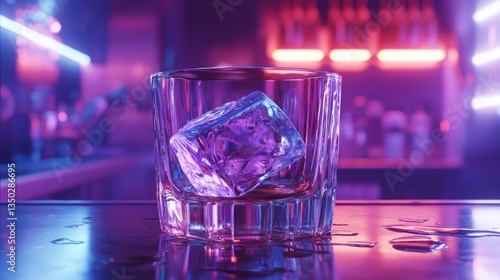 Neon Nights: A Single Ice Cube in a Glass at a Vibrant Bar