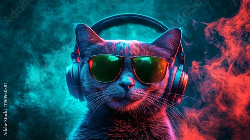 Neon Party Cat DJ Cool Cat with Headphones and Sunglasses in a Vibrant, Colorful Setting