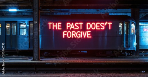 Neon past doesn t forgive sign glowing faintly on abandoned train station deep navy and bright silver symbolizing weight of history