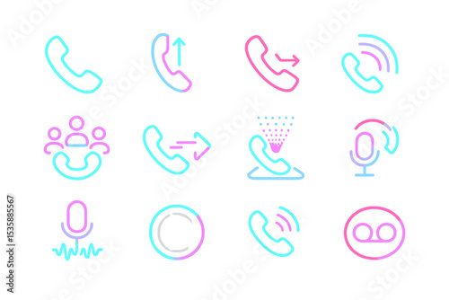 Neon phone icon set with communication and microphone symbols