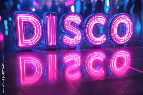 Neon pink and blue disco sign glowing brightly on a dance floor reflecting in the shiny surface.