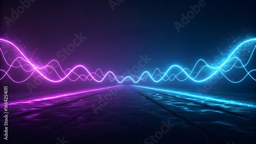Neon Pink and Blue Waveform Light Lines on Dark Floor