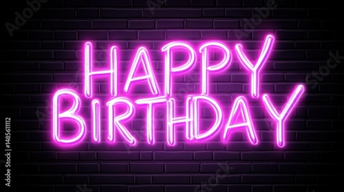 Neon pink "Happy Birthday" sign glowing against a dark brick wall background.
