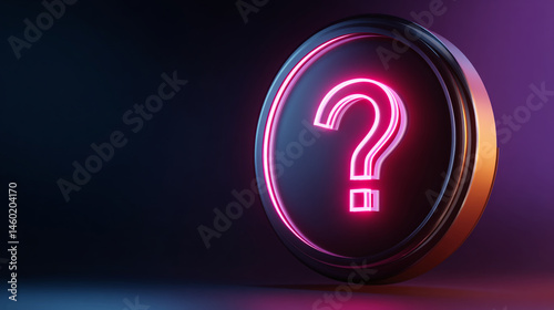 Neon pink question mark in a dark metallic circle, on a dark background, suggesting inquiry, mystery, or problem-solving