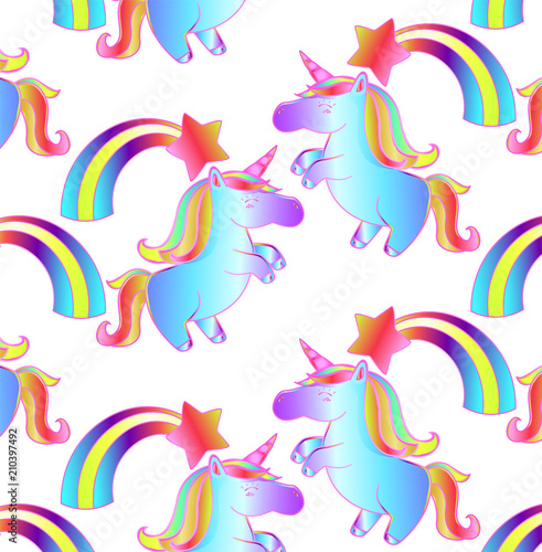 Neon ponies and a rainbow on an isolated background. Fairy tale pattern - an idea for a child's invitation card. Beautiful neon unicorn with a cartoon rainbow