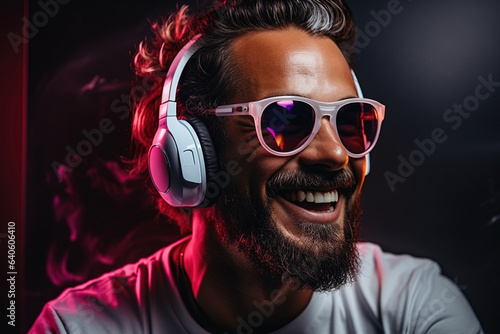 Neon portrait of bearded smiling man in headphones, sunglasses, white t-shirt. Listening to music.
