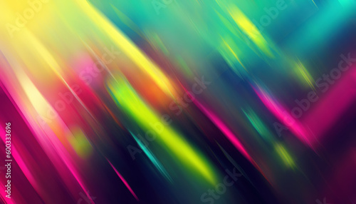 Neon rays. Light motion. Blur glow. Defocused bright pink yellow green blue color flare beam smooth texture art illustration free space abstract background.