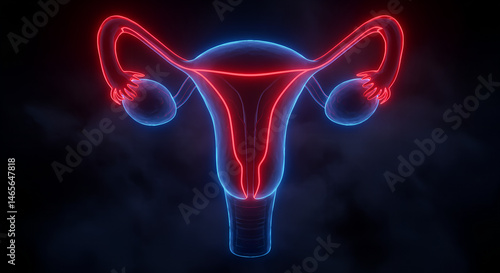 Neon red digital rendering of female reproductive system, highlighting uterus and ovaries in glowing detail on dark background Concepts women's health, reproductive anatomy, gynecology, care, medical