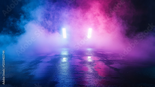 neon reflections on wet asphalt in a smoky urban nightscape