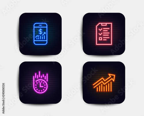 Neon set of Interview, Fast delivery and Mobile finance icons. Demand curve sign. Checklist file, Stopwatch, Phone accounting. Statistical report. Neon icons. Glowing light banners