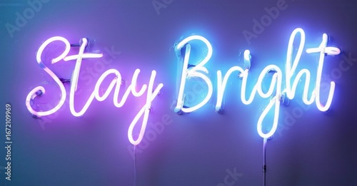 Neon sign displays Stay Bright script. Purple background provides contrast. Simple message, positive vibes, modern aesthetic.