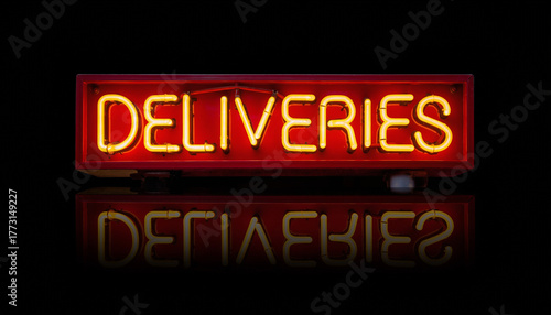 Neon Sign Illuminating the Word Deliveries in Bold Red Lettering Against a Black Background