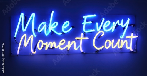 Neon sign make every moment count indigo cyber gold glowing inside time management masterclass softly reflecting off luxury event hall ceilings
