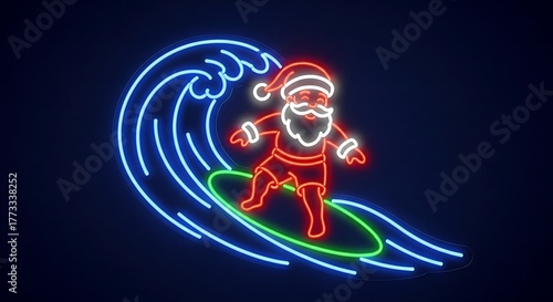 Neon Sign of Santa Surfing on a Wave at Night santa claus