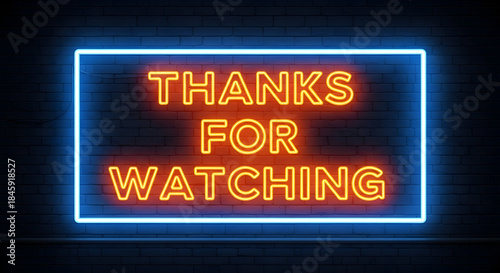 Neon sign that says thanks for watching in orange and blue.