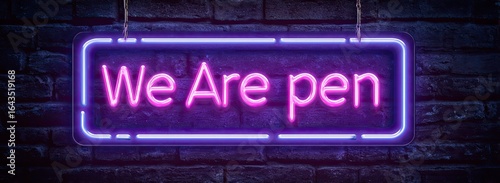 Neon sign "We Are Open" on a brick wall
