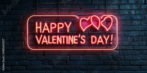 Neon sign wishing a happy Valentine's Day on a brick wall.