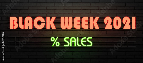 neon sign with message BLACK FRIDAY 2021 SALES on a dark brick wall background