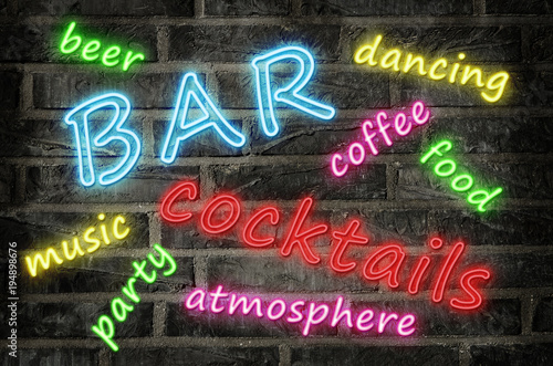 neon sign word cloud illustration with words in different colors describing a cocktail night bar