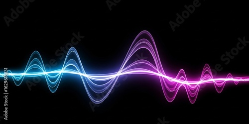 Neon soundwave in smooth curve glowing on black background, audio abstract concept