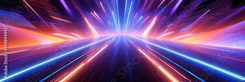 Neon Speed Tunnel: Abstract digital art depicting a vibrant neon tunnel with streaks of blue, purple, and orange light, creating a sense of speed and energy.