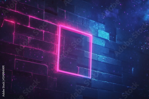 Neon square frame on a brick wall, glowing in blue and pink, with abstract cosmic background. Use for posters, games, or digital art