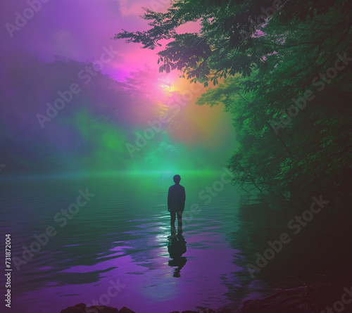 Neon Sunrise in Misty Forest: Solitary Reflection by the Lake