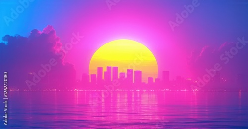Neon sunset with pink and blue skyline, glowing with bright, colorful illumination against a dark background, creating a nostalgic, surreal atmosphere