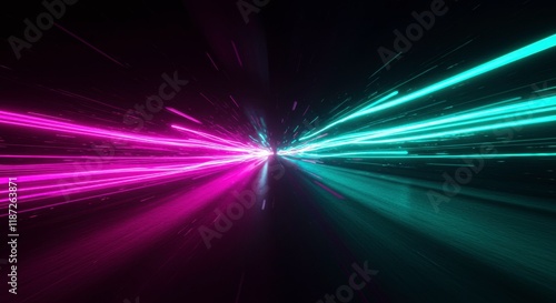 Neon Tunnel: Capturing the dynamic convergence of vibrant neon streaks that lead the viewer toward a point of light, the futuristic image evokes a sense of speed, energy and technological advancement.