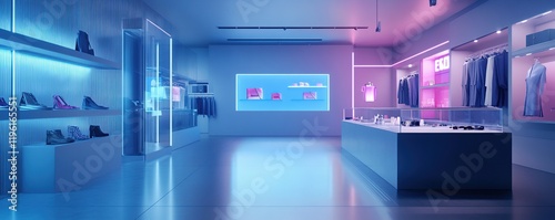 Neon-Lit Boutique: Modern Retail Space Design with Futuristic Ambiance and Stylish Apparel Displayed Effectively.