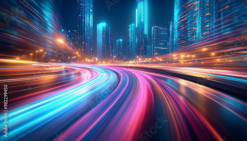 Neon-lit city streets with futuristic motion blur and glowing light trails at night