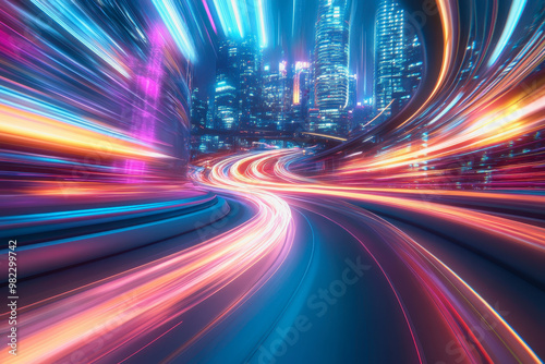 Neon-lit city streets with futuristic motion blur and glowing light trails at night