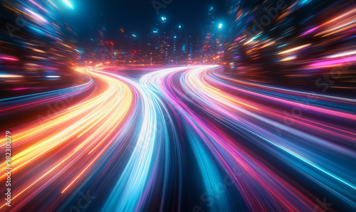 Neon-lit city streets with futuristic motion blur and glowing light trails at night