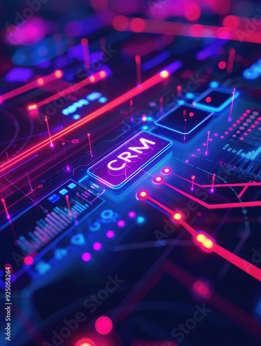 Neon-lit digital interface with CRM button and futuristic graphics. Concepts of customer relationship management, technology, and data analysis.