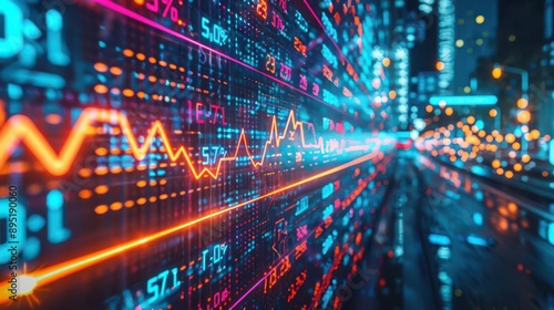 Neon-lit financial data display with colorful upward arrows and fluctuating numbers