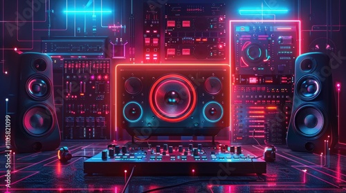 Neon-lit music studio setup with speakers, mixer, and synthesizer.