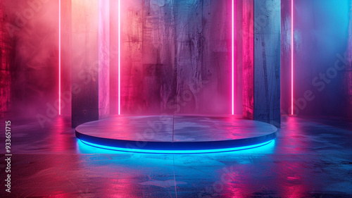 Neon-lit stage setup with fog in a modern venue during nighttime